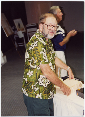 Herbert W. Kale II opening a box to a carousel slide tray at the April 1994 meeting of the Florida Ornithological Society held at the Ramada Hotel and Conference Center in West Palm Beach, Florida.