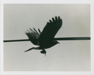Black and white photograph of an Everglade snail kite in flight with a turtle held in its talons. Date is approximate.