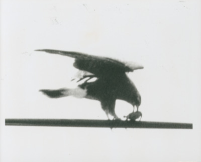 Black and white photograph of an Everglade snail kite feeding on a small turtle on May 19, 1971, in Everglades National Park in Miami-Dade County, Florida, during the 1971 South Florida drought.