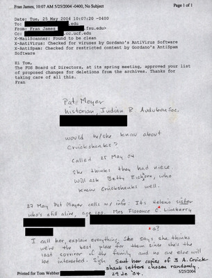 A collection of documents related to the Florida Ornithological Society’s Spring 2004 meeting, including an overview of the archives housed in the Bird Range of the Florida Museum of Natural History, assorted documents related to White-crowned pigeon studies in the Florida Keys, Board of Directors meeting packet, minutes from the Fall 2003 meeting, meeting plans, Breeding Bird Atlas artwork, Records Committee report, agenda, schedule of events, and handwritten notes. Also included is “Published Record of Florida Christmas Bird Counts in Florida Field Naturalist: A Proposal.”