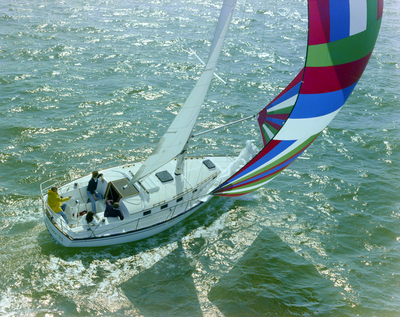 Endeavour 33 yacht sailing with multiple people visible on deck and full sails deployed.