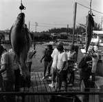 People gut fish on the docks during a fishing event associated with Standard Oil.
