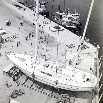 Gandy, George Skip IV, "Aerial View of Boat at Launch Event, Featherstone Marine, F" (1970). Gandy Photographs - General, Culture, Politics. Image 3964.