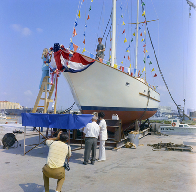 Gandy, George Skip IV, "Attendee Sets up Decorations at Boat Launch, Featherstone Marine" (1970). Gandy Photographs - General, Culture, Politics. Image 3965.