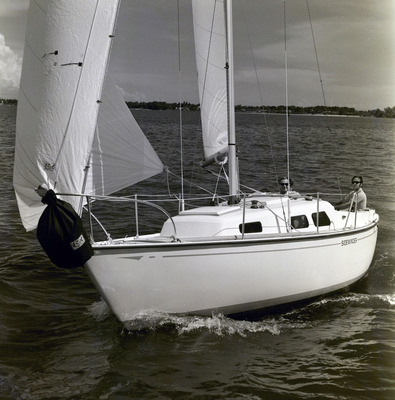 Gandy, George Skip IV, "Two People in Sidewinder Sailboat, Featherstone Marine" (1975). Gandy Photographs - General, Culture, Politics. Image 3974.