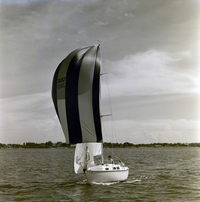Gandy, George Skip IV, "Sailboat with Striped Sail in Tampa Bay, Featherstone Marine, A" (1975). Gandy Photographs - General, Culture, Politics. Image 3975.
