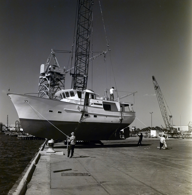 Gandy, George Skip IV, "Individuals Hold Ropes Attached to Gray Gull Boat, Featherstone Marine, A" (1971). Gandy Photographs - General, Culture, Politics. Image 4027.