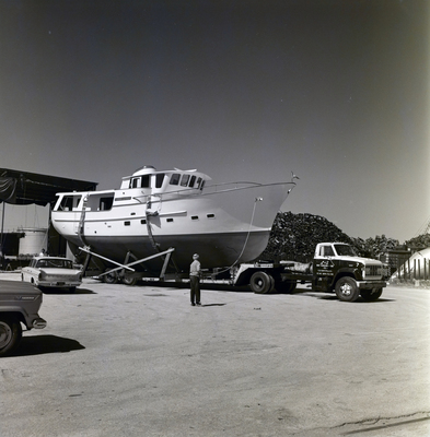 Gandy, George Skip IV, "Gray Gull Boat Transported on Trailer, Featherstone Marine, B" (1971). Gandy Photographs - General, Culture, Politics. Image 4033.