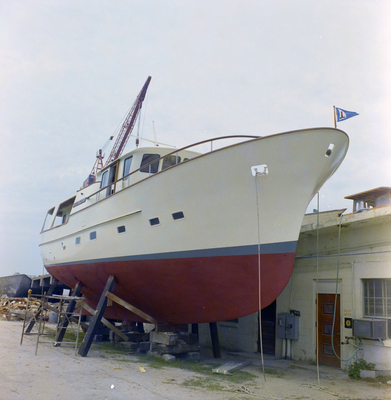 Gandy, George Skip IV, "Gray Gull Boat on Land, Featherstone Marine, A" (1971). Gandy Photographs - General, Culture, Politics. Image 4034.