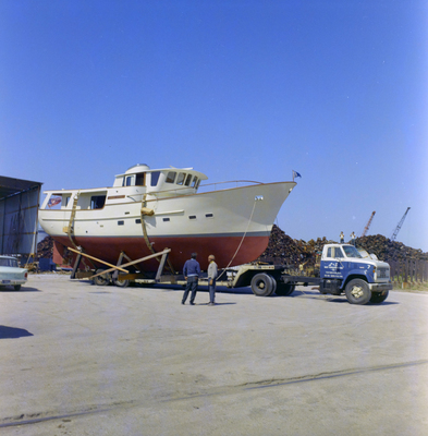 Gandy, George Skip IV, "Gray Gull Boat Transported on Trailer, Featherstone Marine, C" (1971). Gandy Photographs - General, Culture, Politics. Image 4038.