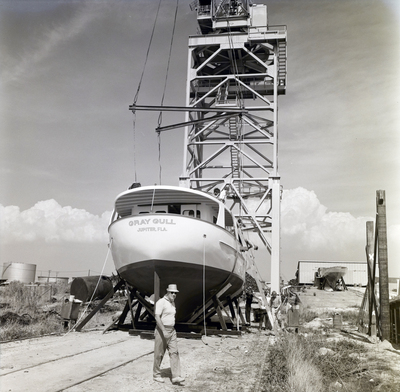 Gandy, George Skip IV, "Gray Gull Boat Attached to Crane, Featherstone Marine, B" (1971). Gandy Photographs - General, Culture, Politics. Image 4046.