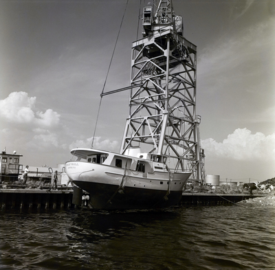 Gandy, George Skip IV, "Gray Gull Boat Attached to Crane, Featherstone Marine, F" (1971). Gandy Photographs - General, Culture, Politics. Image 4051.