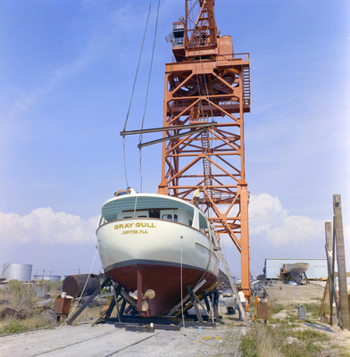 Gandy, George Skip IV, "Gray Gull Boat Attached to Crane, Featherstone Marine, K" (1971). Gandy Photographs - General, Culture, Politics. Image 4055.