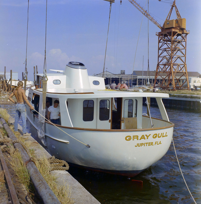Gandy, George Skip IV, "Gray Gull Boat Attached to Crane, Featherstone Marine, R" (1971). Gandy Photographs - General, Culture, Politics. Image 4060.