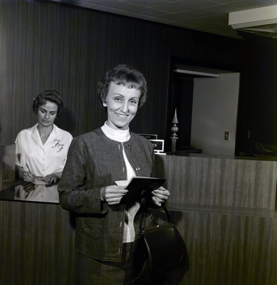Gandy, George Skip IV, "Woman Holding Booklet in Bank, Fidelity Federal Ad, B" (1975). Gandy Photographs - General, Culture, Politics. Image 4105.