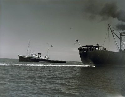 A ship passing the tugboat motor vessel Thames at sea for Fillette Green.