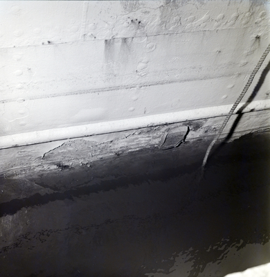 Fire damage on the ship SS Irish Poplar. Rope is hanging in front of hull. Photo of exterior damage taken for Fowler, White, Gillen, Humkey, and Trenam law firm.