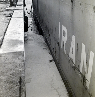 Fire damage on the ship SS Irish Poplar. The letters "IRAN" is printed on the hull. Photo of exterior damage taken for Fowler, White, Gillen, Humkey, and Trenam law firm.