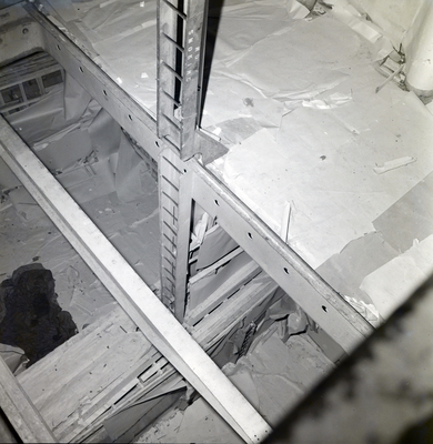 Ladder inside S. S. Orinoco for Fowler and White law firm. Walls and floors covered in large sheets of paper.