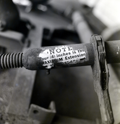 Close up of label on Bush Hog attachment parked outside McLeod's Garage & Service Station in Wimauma, FL. Label has "Note Four (4) inches is the MAXIMUM Extension at ---her end" printed on it. Photo taken for attorney Dennis Slater at Fowler, White, Collins, Gillen, Humkey, and Trenam law firm.