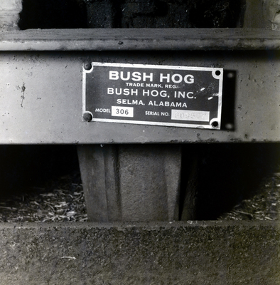 Close up of label on Bush Hog attachment parked outside McLeod's Garage & Service Station in Wimauma, FL. Label has "BUSH HOG TRADE MARK, REG. BUSH HOG., INC. SELMA, ALABAMA MODEL 306 SERIAL NO. 609577" printed on it. Photo taken for attorney Dennis Slater at Fowler, White, Collins, Gillen, Humkey, and Trenam law firm.
