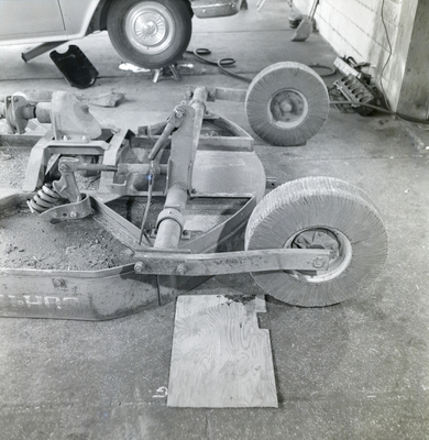 Bush Hog tractor attachment parked outside McLeod's Garage & Service Station in Wimauma, FL. A piece of plywood is on the ground next to the Bush Hog. Photo taken for attorney Dennis Slater at Fowler, White, Collins, Gillen, Humkey, and Trenam law firm.