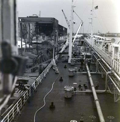 Janku Jamara ship deck, docked in a harbor. Three men are standing on the deck.