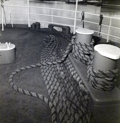 SS Halcyon Panther ship deck. A long, thick length of rope is wrapped around and laid out in front of two large posts on deck. Photo taken for Fowler, White, and Collins.