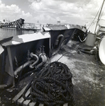Damaged bow of the ship M. S. Athinai. View from onboard the ship. A pile of rope sits on the deck. Photo taken for Fowler, White, and Collins.