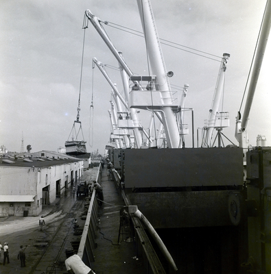 Site of an accident at the ship TIHA Monrovia. Workers on the dock are unloading materials from the ship. Photo taken for Fowler, White, and Collins.