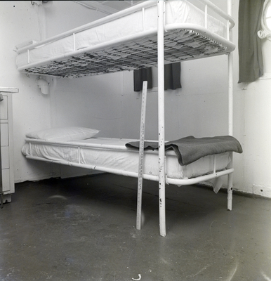 Bunk beds in cabin on S. S. Marine Enterprises. A yardstick with "DAVIS ISLANDS SERVICE CENTER Shell Products" printed on it is leaning against bottom bunk. A dresser is to the left of the beds. A folded blanket is at the foot of the bottom bed. Photo taken for Fowler, White, and Collins.