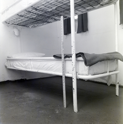 Bunk beds in cabin on S. S. Marine Enterprises. A yardstick with "DAVIS ISLANDS SERVICE CENTER Shell Products" printed on it is leaning against bottom bunk. A folded blanket is at the foot of the bottom bed. Photo taken for Fowler, White, and Collins.