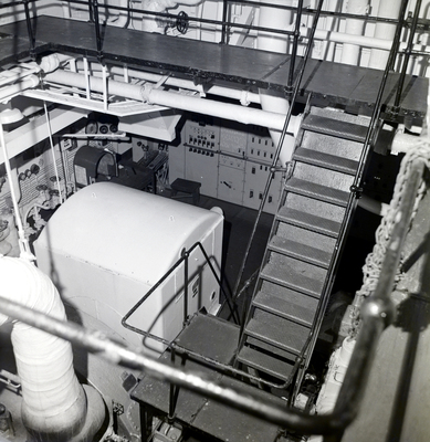 Stairs and walkway on M/V Penn Transporter ship. Stairs lead down into room with several valves and control panels. "Greetings Happy New Years" is written on one of the panels. Photo taken for Fowler and White.