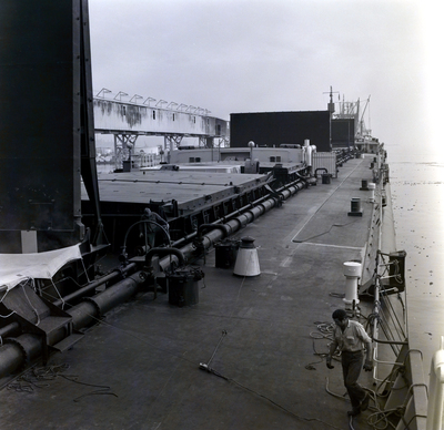 M/V Bornheim deck. A large pipe runs along the length of the ship. A man is walking across the deck. Photo taken for Fowler and White.