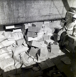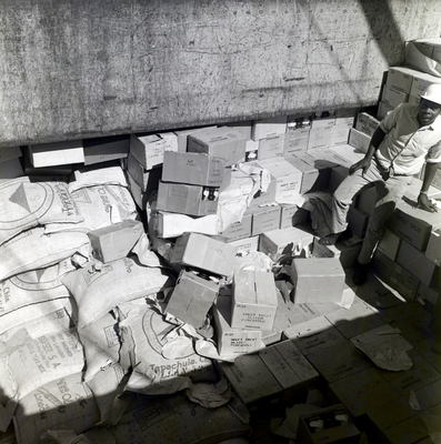 M/V Loretto cargo. Boxes of "Sweet Tooth Sliced Pineapple" have been damaged and opened. A worker wearing a hardhat sits on the boxes. Burlap sacks of unidentified goods are also stacked next to the boxes. Photo taken for Fowler and White.