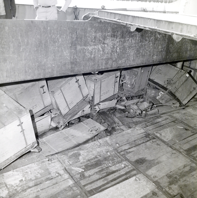 M/V Loretto cargo. Damaged boxes of unidentified goods from Mexico are in the hold. Photo taken for Fowler and White.