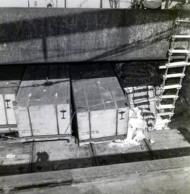 M/V Loretto cargo. Damaged boxes of unidentified goods from Mexico and damaged sacks of dicalite are in the hold. A rope ladder hangs down from the deck in front of the hold. Photo taken for Fowler and White.