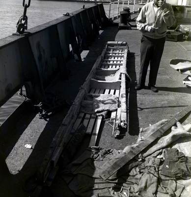 M/V Loretto deck. A broken part of the ship lays on the deck with a man standing beside it. Photo taken for Fowler and White.