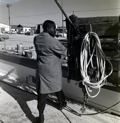 Lisa A. A man in a coat stands on deck looking off to the right. Chains and rope are coiled and hung on the ship. Photo taken for Fowler and White.