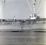 Insco Producer. View of damage on outer starboard hull, with rope ladder and hanging plank suspended on the side of the ship. Photo taken for Fowler and White.