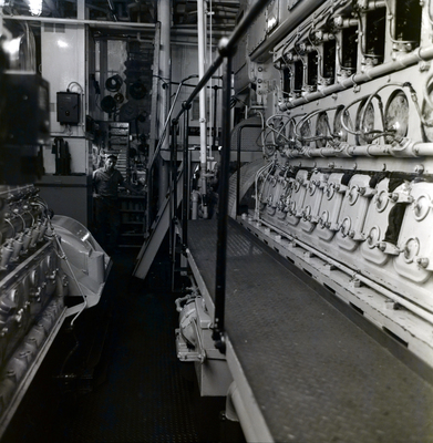 Tugboat Peggy Sheridan engine room. A man stands in the background. Photo taken for Fowler, White, G., H., and K.