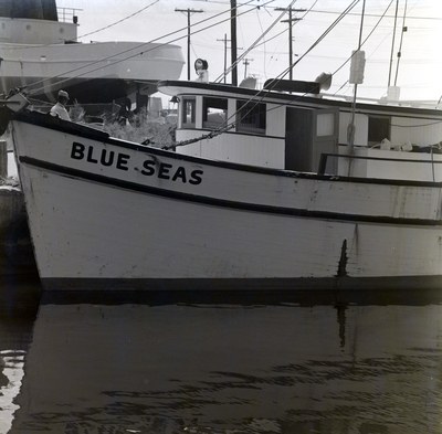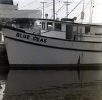 Shrimp boat Blue Seas. View of the port side of ship, with the name "Blue Seas" printed on the hull. A man stands on deck facing away from the camera. Photo taken for Fowler, White, and Gillen.