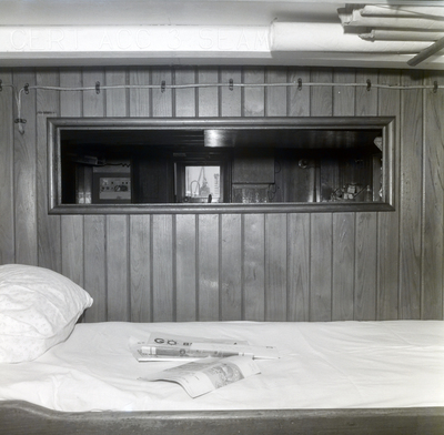 Shrimp boat Blue Seas. Quarters on ship. View of a bed with papers and mail resting on top. There is a passthrough opening in the wall behind the bed. Photo taken for Fowler, White, and Gillen.