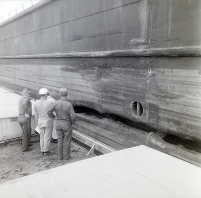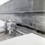 Barge Patricia Sheridan. Four men stand next to the barge and look at a large gash in its hull. Photo taken for Fowler and White.