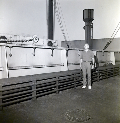 M/V Campanella deck. A man is standing next to a walkway covering a set of pipes on deck. Photo taken for Fowler, White, G., H., and K.