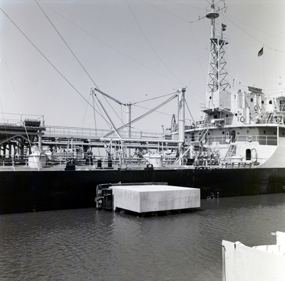 USNS Tallulah deck. The ship is next to a platform in the water. Photo taken for Fowler, White, H., G., and K.