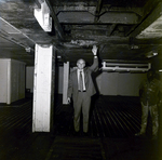 M/V Banana Planter. A man stands behind the trapdoor facing the camera with his left arm raised above his head to touch the ceiling. Another man stands to the side looking at him. Photo taken for Fowler, White, and Gillen.