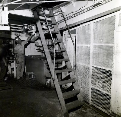 Tugboat D. J. Sheridan. Two workers in a hardhat stand behind a metal staircase. Photo taken for Fowler, White, G., H., K., and B.