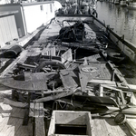 Sunken shrimp boat Captain Frankie. The deck has sustained substantial damage. There are broken boxes and equipment on deck. Photo taken for Fowler, White, Gillen, Humkey, K., and B.