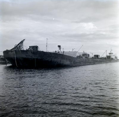 Barge Ocean 115. Port side view of ship docked at a harbor. Several cranes can be seen in the background. The name "Ocean 115" is printed on the hull., but is faded and partially worn away. Photo taken for Fowler, White, and Gillen.
